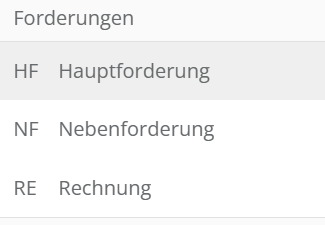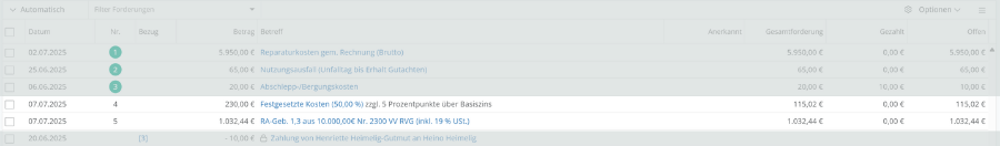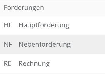 Die eingetragenen Nebenforderungen erscheinen im Forderungskonto unter der Sortierung einer einfachen Ziffer.