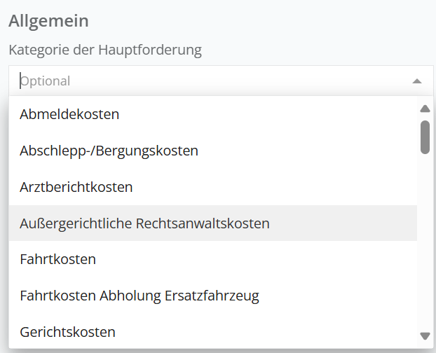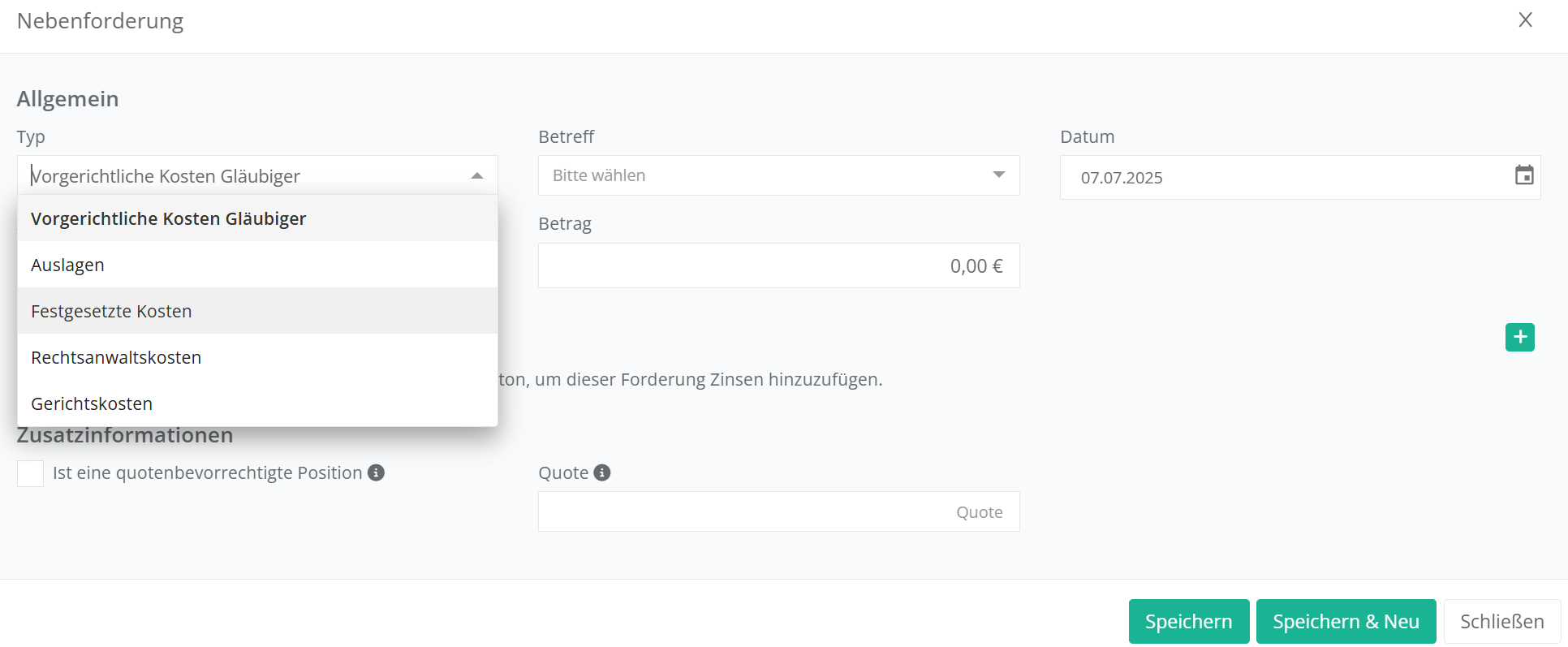 Es erscheint ein Eingabefenster. Hier können Sie zunächst wählen, um welche Art der Nebenforderung es sich handelt.