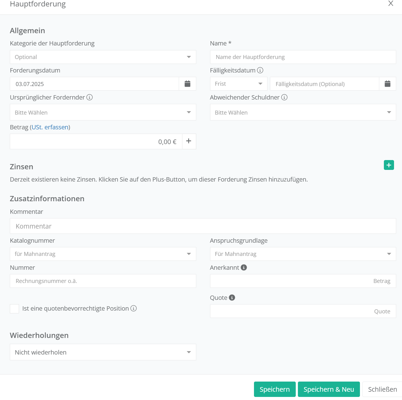 Wählen Sie den Unterpunkt „Hauptforderung“ aus. Es erscheint eine zunächst leere Eingabemaske: