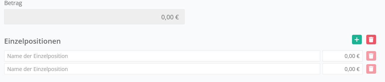 Geben Sie den Betrag der Forderung ein. Sollte sich dieser aus Einzelpositionen zusammensetzen, klicken Sie auf das Plus-Symbol, um eine erweitere Eingabe der einzelnen Punkte treffen zu können.