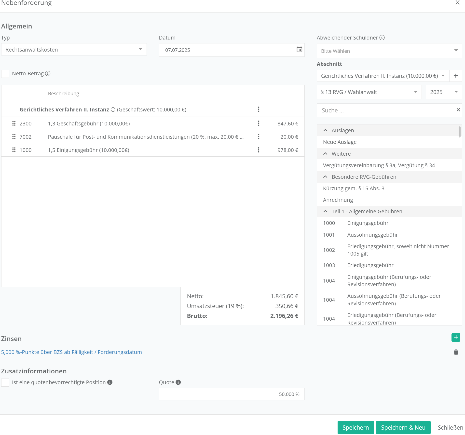 Wenn Sie „Rechtsanwaltskosten“ auswählen, erscheint eine Maske, in der Sie die entsprechenden RVG-Gebühren als Kostenpositionen auswählen können. Sie können hierbei auch angeben, ob Sie diese Positionen in Netto oder Brutto dem Forderungskonto hinzufügen möchten; je nach dem, ob der Mandant vorsteuerabzugsberechtigt ist, oder nicht.
