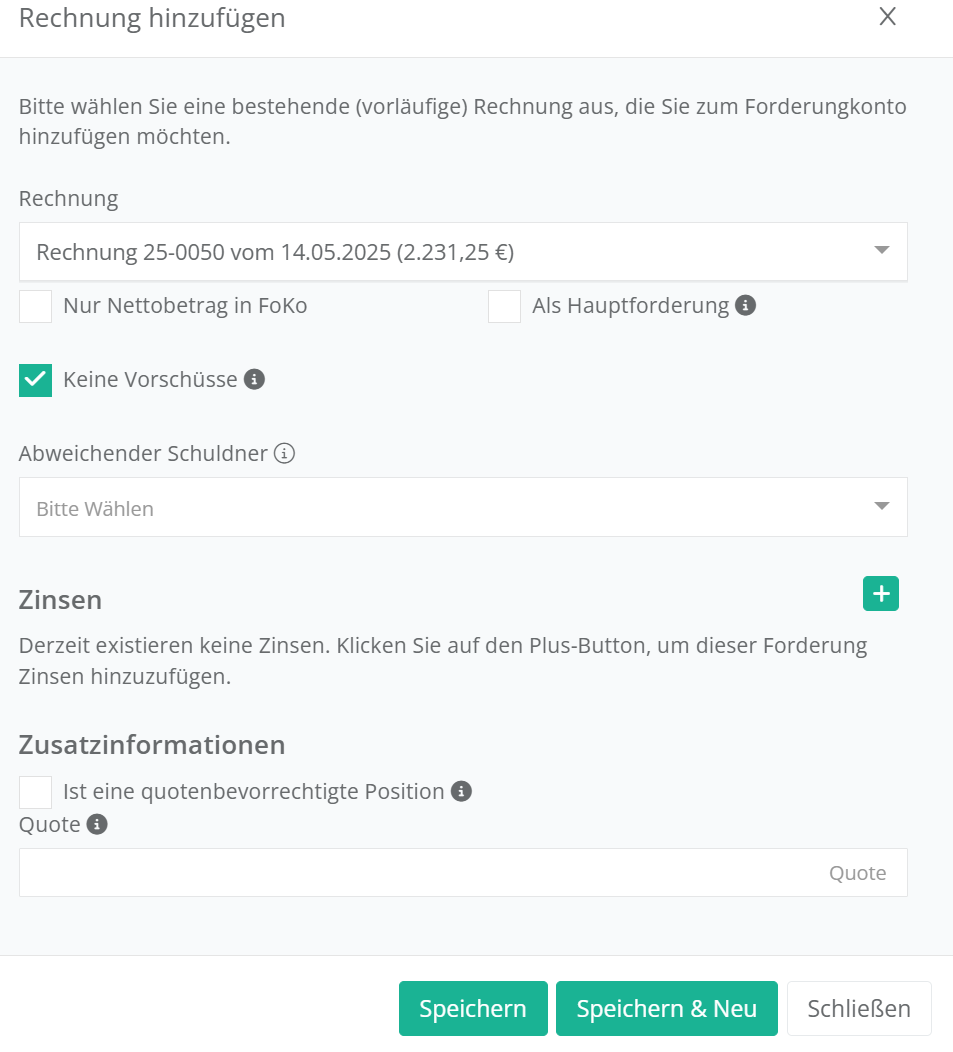 Falls Sie die Hauptforderung in einem Forderungskonto eintragen, das eine Quote besitzt, können Sie hier hinterlegen, welcher Betrag von der Gegenseite schon anerkannt wurde. Diese Eintragung dient der reinen Information und hat keine Auswirkung auf die Darstellung der offenen Forderungen innerhalb des FoKos.