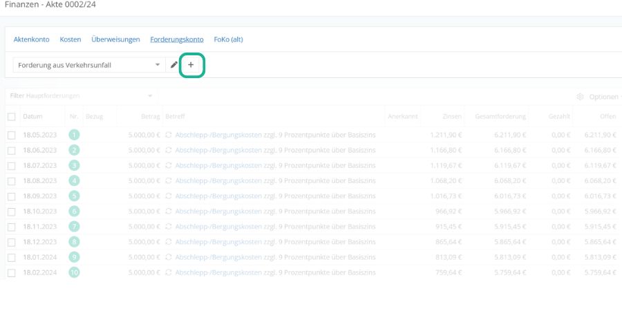 Sollten sich bereits ein Forderungskonto in der Akte befinden, können Sie ein weiteres neues FoKo anlegen, indem Sie auf den Plus-Button oben in der Leiste klicken.
