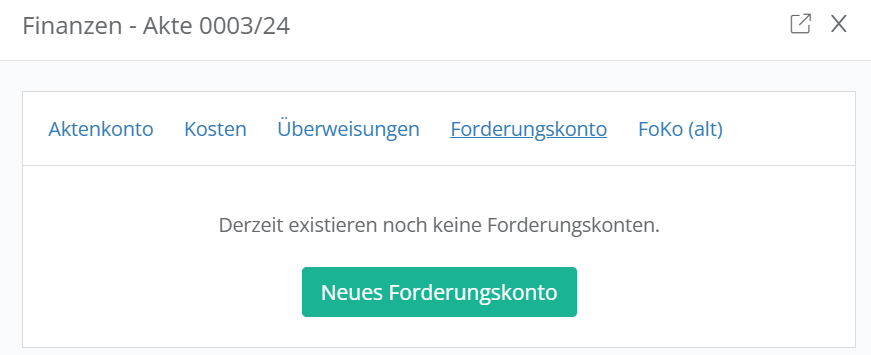 Wenn Sie in dieser Akte erstmalig ein Forderungskonto erstellen, dann erscheint diese Ansicht: