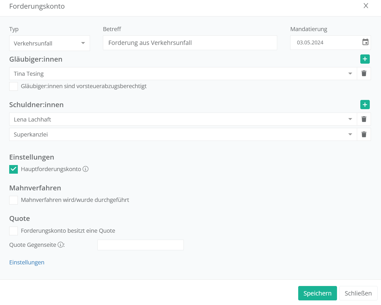Um zu erfahren, wie Sie nun Haupt- und Nebenforderungen zu Ihrem erstellten Forderungskonto hinzufügen, lesen Sie bitte diesen Artikel.