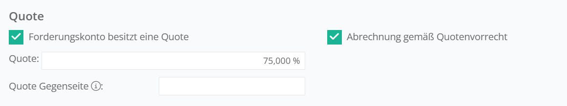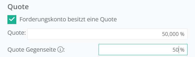 Eintragungen im Feld „Quote Gegenseite“ haben keine Auswirkung auf das Forderungskonto. Es ist nur ein Hinweis von welcher Quote die Gegenseite ausgeht und wird bei der Erfassung von Abrechnungsschreiben berücksichtigt.