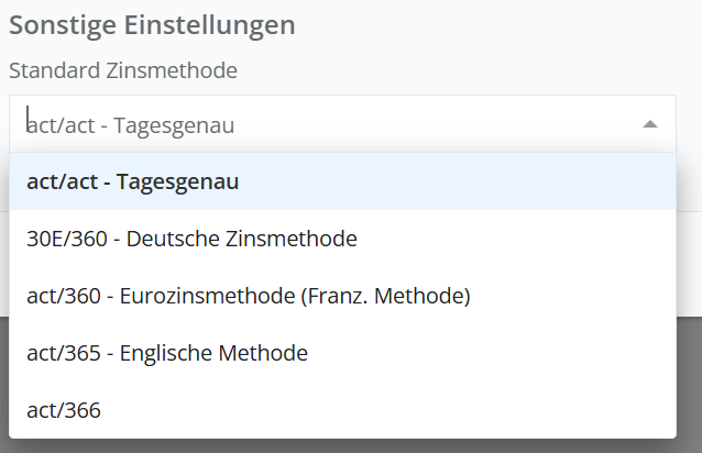 Um für das Forderungskonto generell schon einen Standard-Zinsmethode zu hinterlegen, klicken Sie auf die blaue Schrift „Einstellung“. Dort können Sie eine der gängigen Zinsmethoden auswählen. Sie können im weiteren Bearbeitungsverlauf jedoch bei jeder Forderungsposition, die Sie hinzufügen, auch nochmal individuelle Zinsen pro Position ansetzen und damit die hier gesetzte Standardeinstellung überschreiben.
