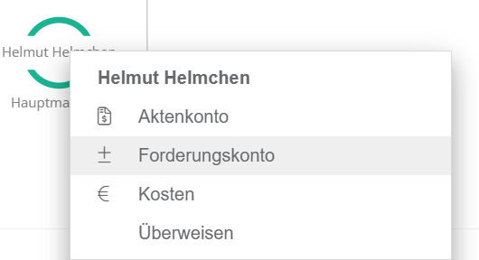 Starten Sie in der Akte im Aktenbeteiligten-Panel. Klicken Sie mit rechts auf den Kontakt, dessen Forderungskonto Sie erstellen, bearbeiten oder einsehen wollen. Wählen Sie „Forderungskonto“ aus.