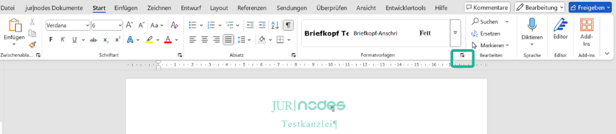 Wie Sie in diesem Artikel detailliert erfahren, setzen sich Dokumente, die Sie über jur|nodes erstellen, aus sogenannten „Bausteinen“ zusammen. Damit diese Bausteine immer in der einheitlichen Schriftart und mit einem festgelegten Absatzabstand zueinander zusammengesetzt werden, benötigt das System hierfür grundlegende Vorgaben. Diese konfigurieren Sie in den betreffenden „Formatvorlagen“ in der Word-Vorlage Ihres Briefkopfs.