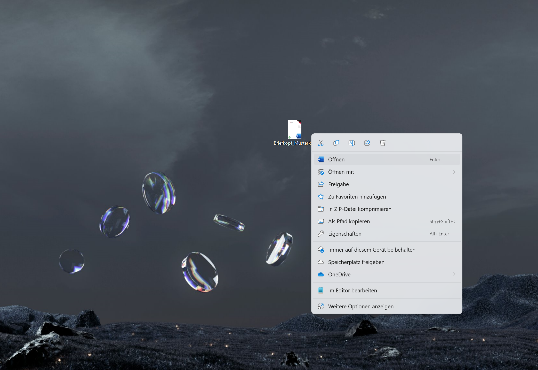 Öffnen die Word-Vorlage Ihres Briefkopfs, indem Sie einen Rechtsklick auf diese Datei ausführen und dann den Punkt „Öffnen“ auswählen.