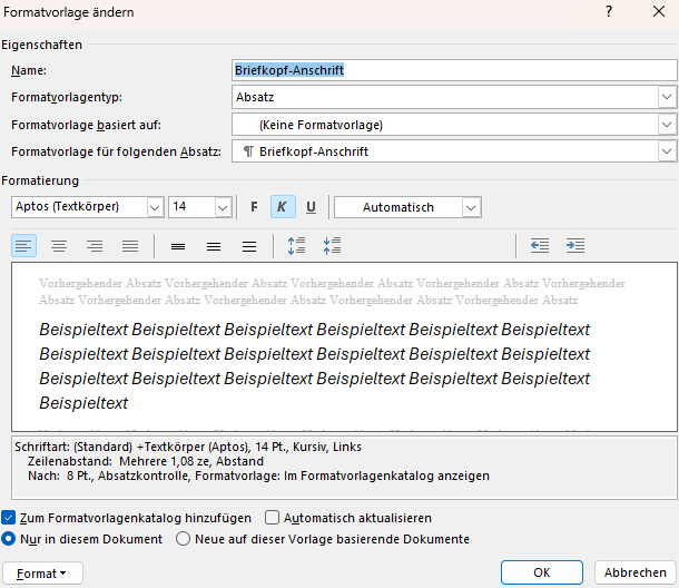 Einstellungen in der Formatvorlage Briefkopf-Anschrift. Der Text ist größer und kursiv: