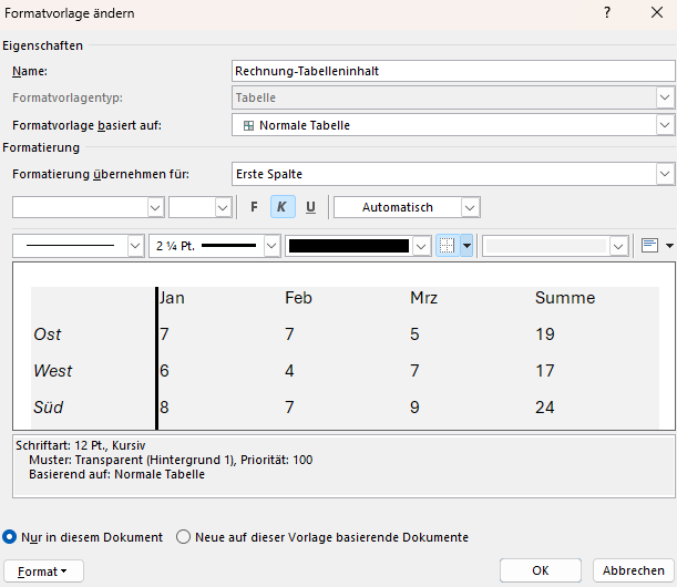 Einstellungen in der Formatvorlage Rechnung-Tabelleninhalt. Die Erste Spalte ist kursiv, der Hintergrund ist grau eingefärbt: