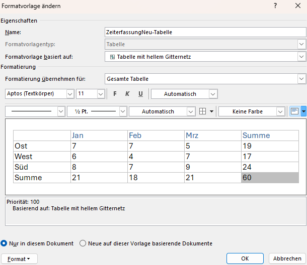 Einstellungen in der Formatvorlage ZeiterfassungNeu-Tabelleninhalt. Die erste Zeile ist Schriftfarbe blau, Tabelle mit hellem Gitternetz als Vorlage: