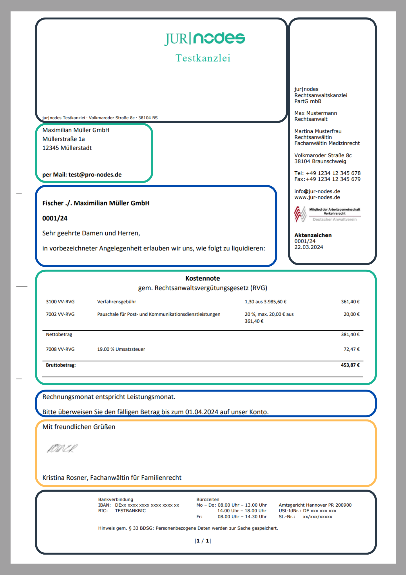 Unter „Vorlagen“ verstehen wir Templates, aus denen Sie finale Dokumente erstellen können. Oben sehen Sie zum Beispiel ein finales Dokument, das auf einer „Rechnungsvorlage“ erstellt wurde: Eine Rechnungsvorlage enthält zunächst den Briefkopf als Grundgerüst, wird dann mit passenden Bausteinen befüllt, die wiederum per Platzhalter die adressatenspezifischen Details aus jur|nodes einfüllen.