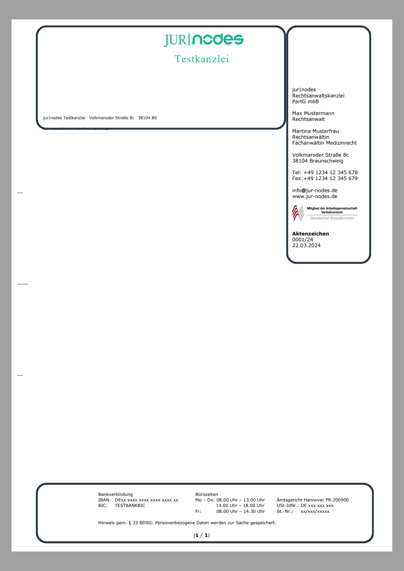 Der Briefkopf dient als formale Visitenkarte am Anfang eines Schreibens, die grundlegende Informationen über den Absender bereitstellt. Er findet sich typischerweise im oberen Bereich der ersten Seite eines Briefes und umfasst wesentliche Angaben wie den Namen und die Adresse des Absenders, in diesem Fall: Ihrer Kanzlei. Zusätzlich kann der Briefkopf auch ein Logo in Form einer Bilddatei enthalten, welches den professionellen Charakter des Schreibens unterstreicht und zur Wiedererkennung beiträgt. Darüber hinaus sind Kontaktinformationen wie Telefonnummer, E-Mail-Adresse und gegebenenfalls die Website des Absenders Teil des Briefkopfes. Zudem kann der „Briefkopf“ auch festplatzierte Informationen im Bereich der Fußzeile enthalten, beispielsweise Bankinformationen, Steuernummer oder Seitenzahl. Hier erfahren Sie, wie Sie Briefköpfe erstellen und bearbeiten können.