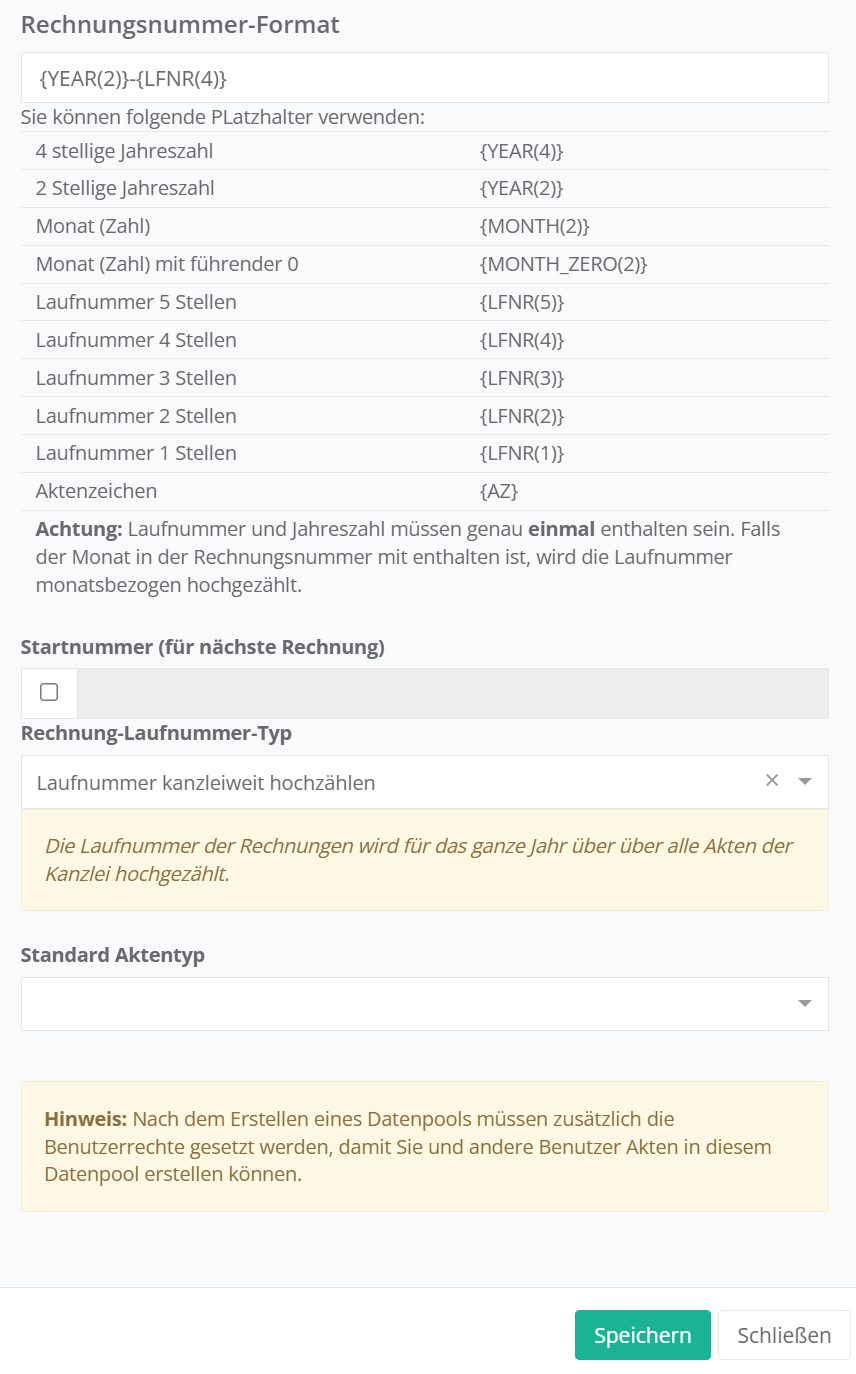 Die Laufnummer der Rechnung wird für das ganze Jahr über über alle Rechnungen und Datenpools der Kanzlei hochgezählt. Bitte beachten Sie, dass manuell vergebene Rechnungsnummern hierbei nicht berücksichtigt werden.