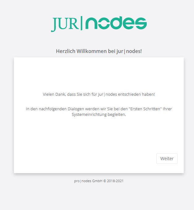 Nachdem Sie das Client-Zertifikat installiert haben, können Sie direkt mit der Ersteinrichtung Ihres Servers starten. Rufen Sie hierzu Ihre Serveradresse (kanzleiname.jur-nodes.net) auf, die Sie in Ihren Zugangsdaten finden.