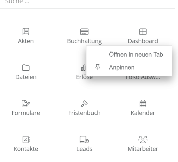 Ein Klick auf eines der Symbole, öffnet den entsprechenden Inhaltsbereich direkt im geöffneten Tab.