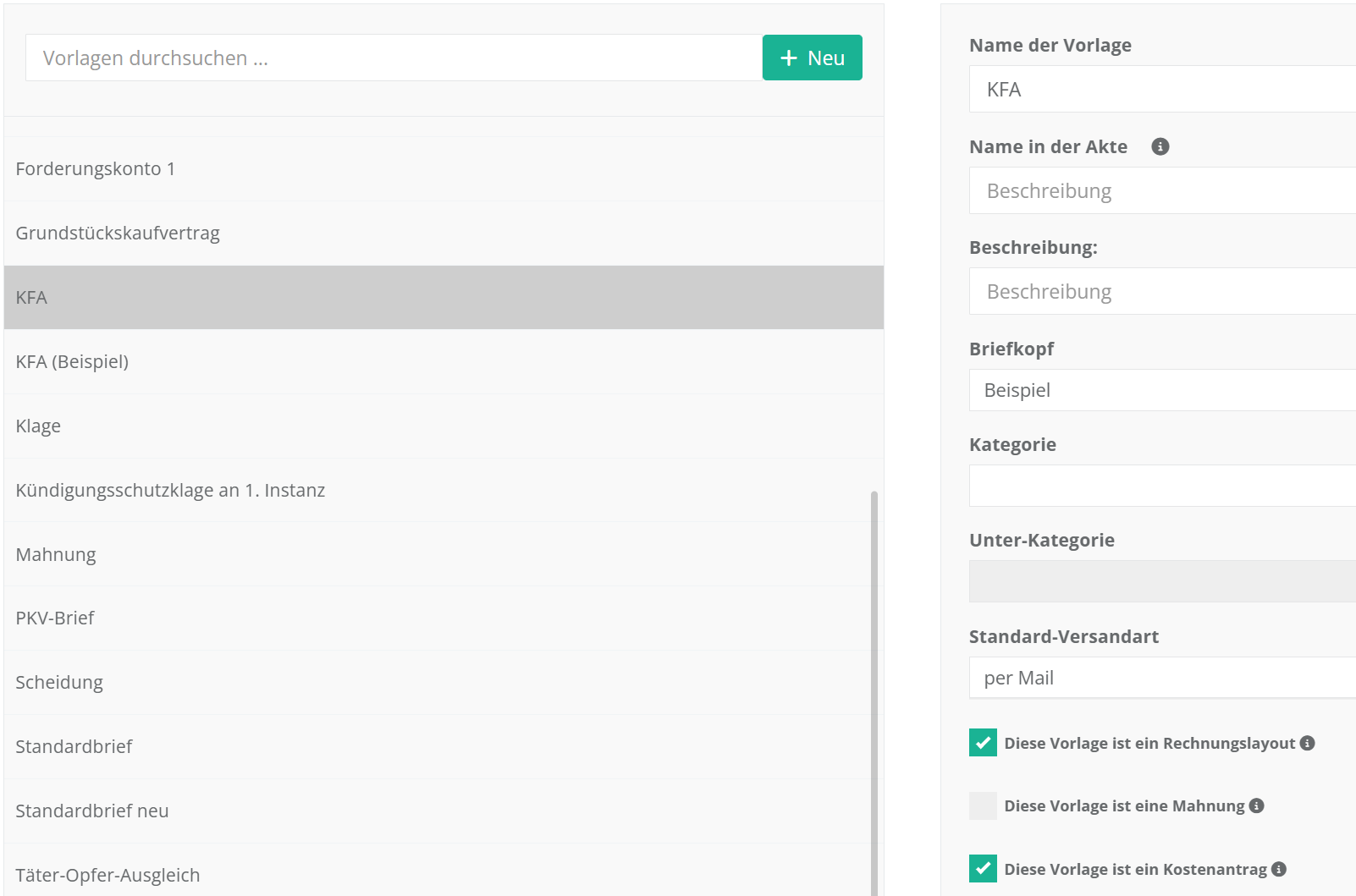 Um einen KFA oder KAA zu erstellen und über die Software zu versenden, benötigen Sie zunächst mindestens eine Dokumentenvorlage, die für Kostenanträge definiert ist. Dafür muss in der jeweiligen Vorlage (Verwaltung – Dokumente – Vorlagen) die Checkbox „Diese Vorlage ist ein Kostenantrag“ aktiviert sein: