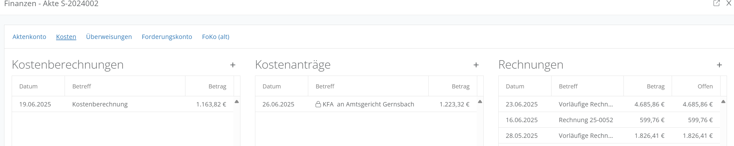 Führen Sie in der Akte einen Rechtsklick auf den Beteiligte aus, an den der Kostenantrag gesendet werden soll. Klicken Sie auf „Kosten“. In der Mitte finden Sie die Spalte zu „Kostenanträgen“.