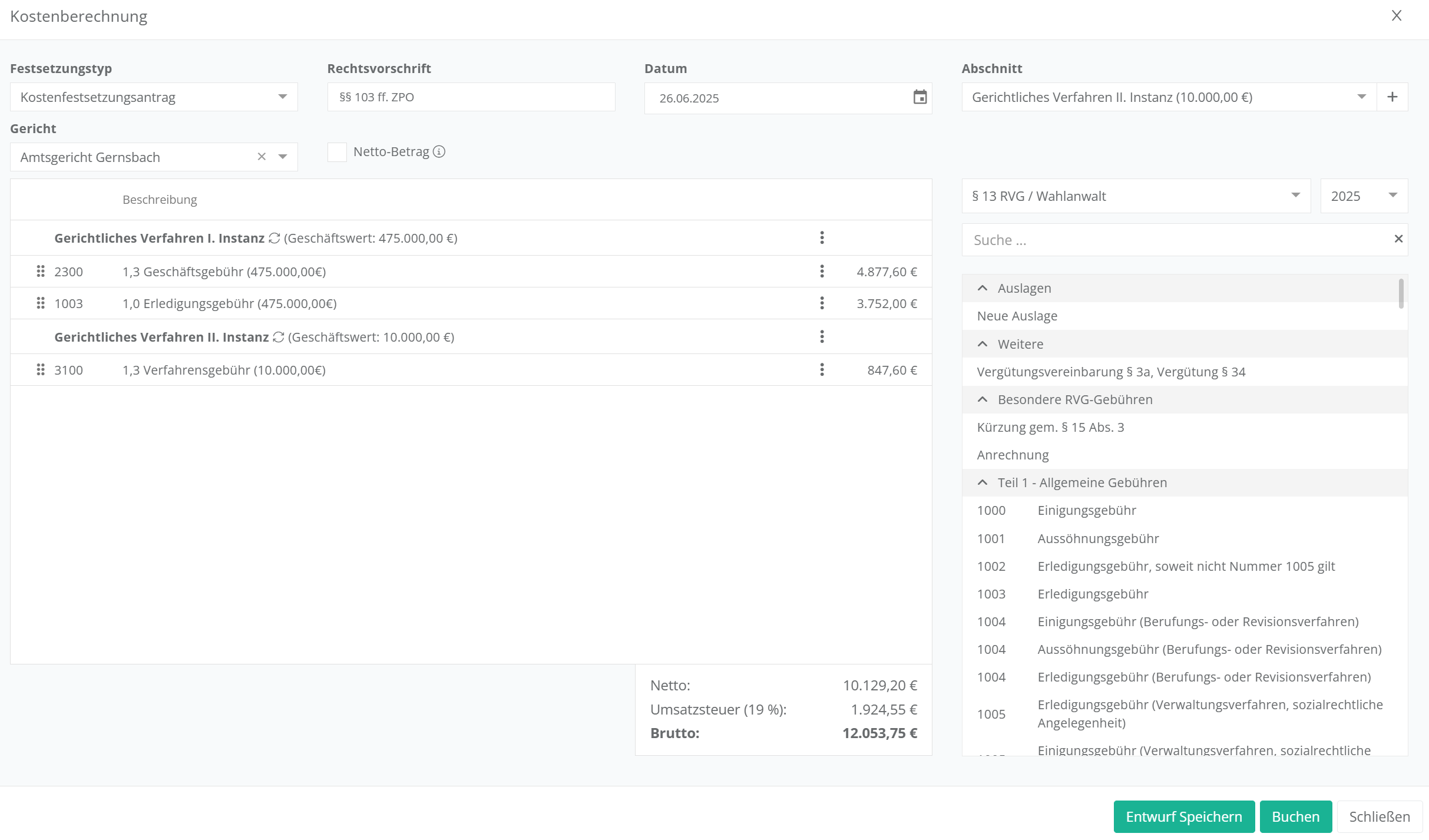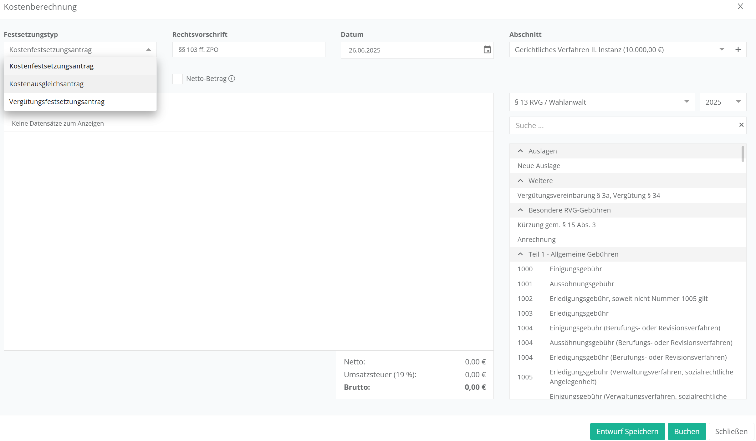 Füllen Sie alle weiteren Felder entsprechend aus und geben Sie über die rechte Spalte die Kostenpositionen an, die Sie in den Antrag einbringen wollen. Achten Sie darauf, dass Sie jeweils den richtigen Abschnitt (Dropdown-Menü oben rechts) auswählen, auf den Sie die Gebühren ansetzen wollen.