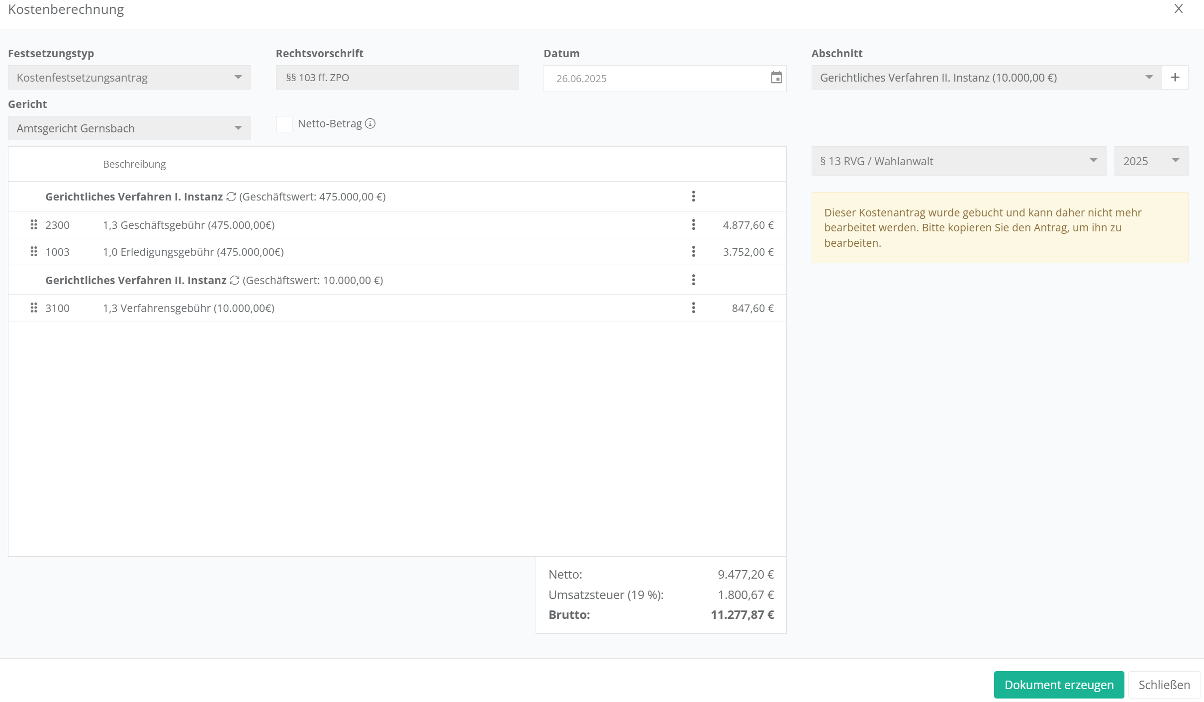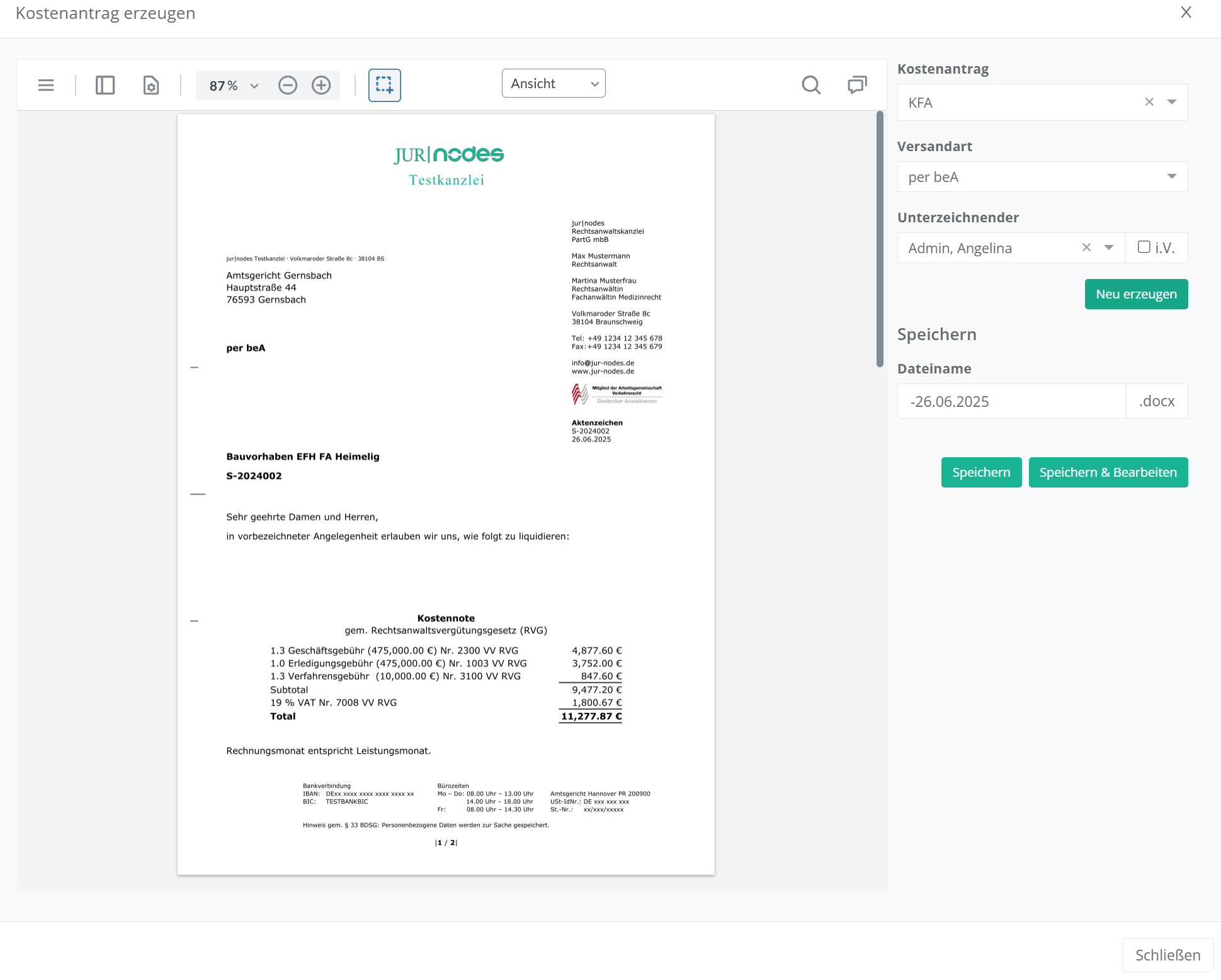 Über den Button „Speichern & Bearbeiten“ können Sie das Dokument noch bei Bedarf anpassen, es öffnet sich dann im Online-Editor oder über Ihren verbundenen Verwaltungsdienst direkt in Word. Wenn Sie auf „Speichern“ klicken, legt sich die versandfertige Datei zum Kostenantrag im Dateisystem der aktuellen Akte ab und kann direkt versendet werden.