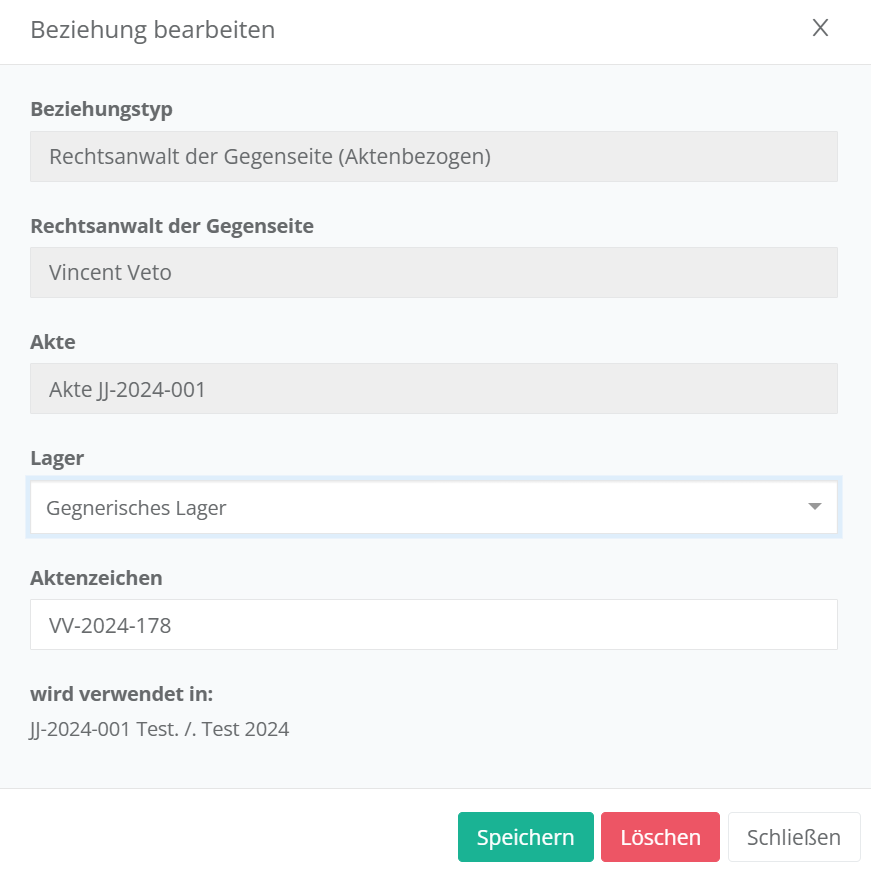 Kontakt „Vincent Veto“ aus dem „gegnerischen Lager“ wurde als „Rechtsanwalt der Gegenseite“ markiert. Es öffnet sich folgendes Dialogfenster, in dem nun das gegnerische Aktenzeichen eingetragen werden kann.