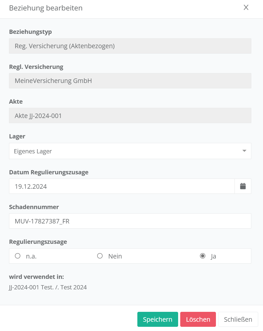 Die Versicherung „MeineVersicherung GmbH“ wurde als „Reg. Versicherung“ (regulierende Versicherung) markiert. Nun kann in der Eingabemaske das Datum und die Zustimmung der Regulierungszusage sowie die Schadennummer hinterlegt werden.