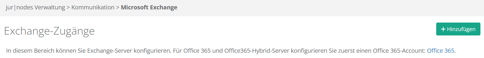 Navigieren Sie in der Verwaltung in den Bereich „Kommunikation“ und den Unterpunkt „Microsoft Exchange“. Klicken Sie auf den Grünen Button „+ Hinzufügen“.