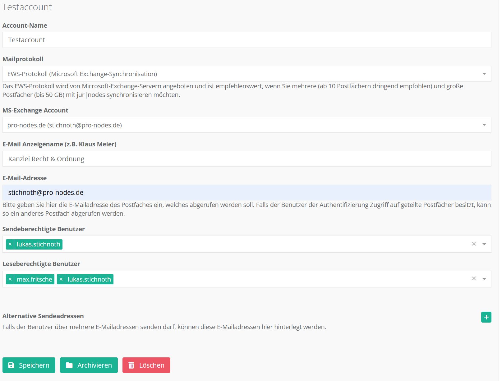 5. Legen Sie fest, welche jur|nodes-Benutzer Mails dieses Postfachs entweder lesen und/oder darüber versenden dürfen.