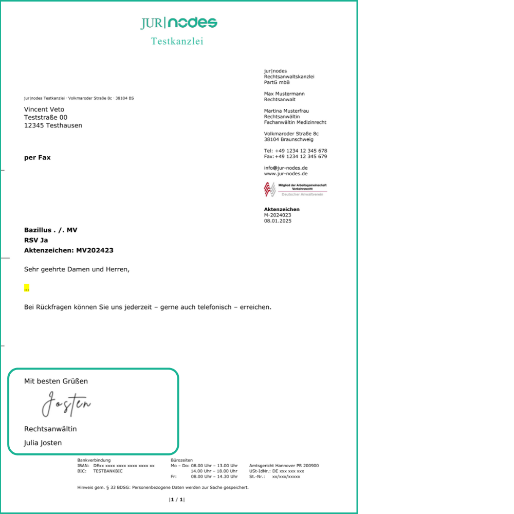 Hier eine Beispielansicht eines Dokuments mit dem Baustein „Briefabschluss“ und grafischer Signatur: