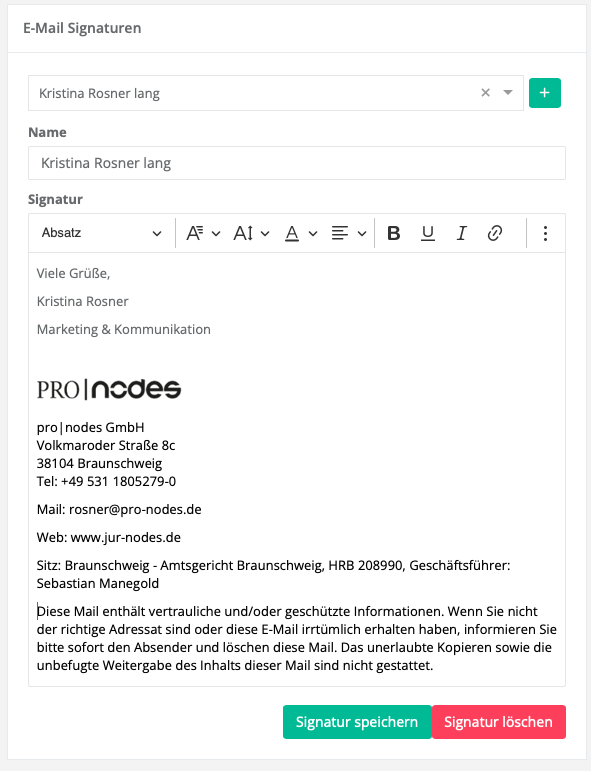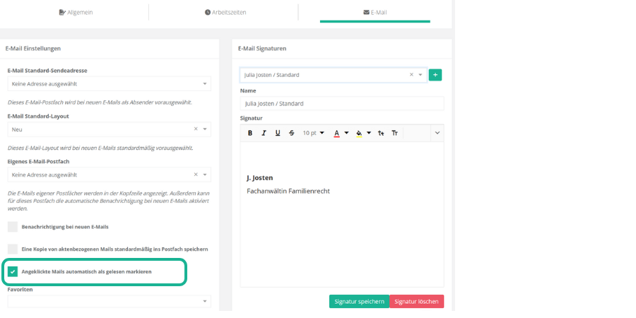 Sie haben in jur|nodes die Möglichkeit, verschiedene Signaturen zu hinterlegen, die über den integrierten E-Mail Client zur Ihren E-Mails hinzugefügt werden können.