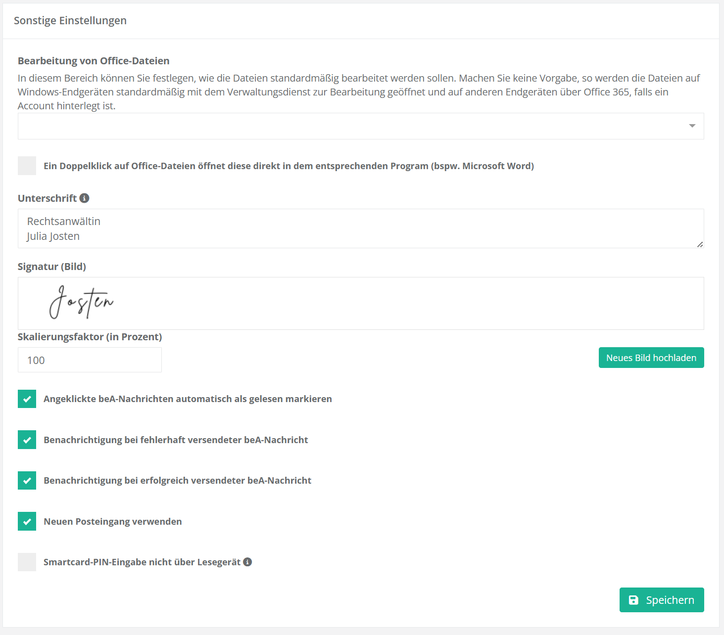 Optional können Sie auch noch eine grafische Signatur (jpeg-Datei Ihrer händischen Unterschrift) hochladen. Diese Bilddatei wird dann über den Baustein „Briefabschluss“ in Dokumente eingefügt. Gehen Sie hierfür auf den Button „Neues Bild hochladen“ und wählen Sie die entsprechend jpeg-Datei aus, die sich in Ihrer Ablage befindet.