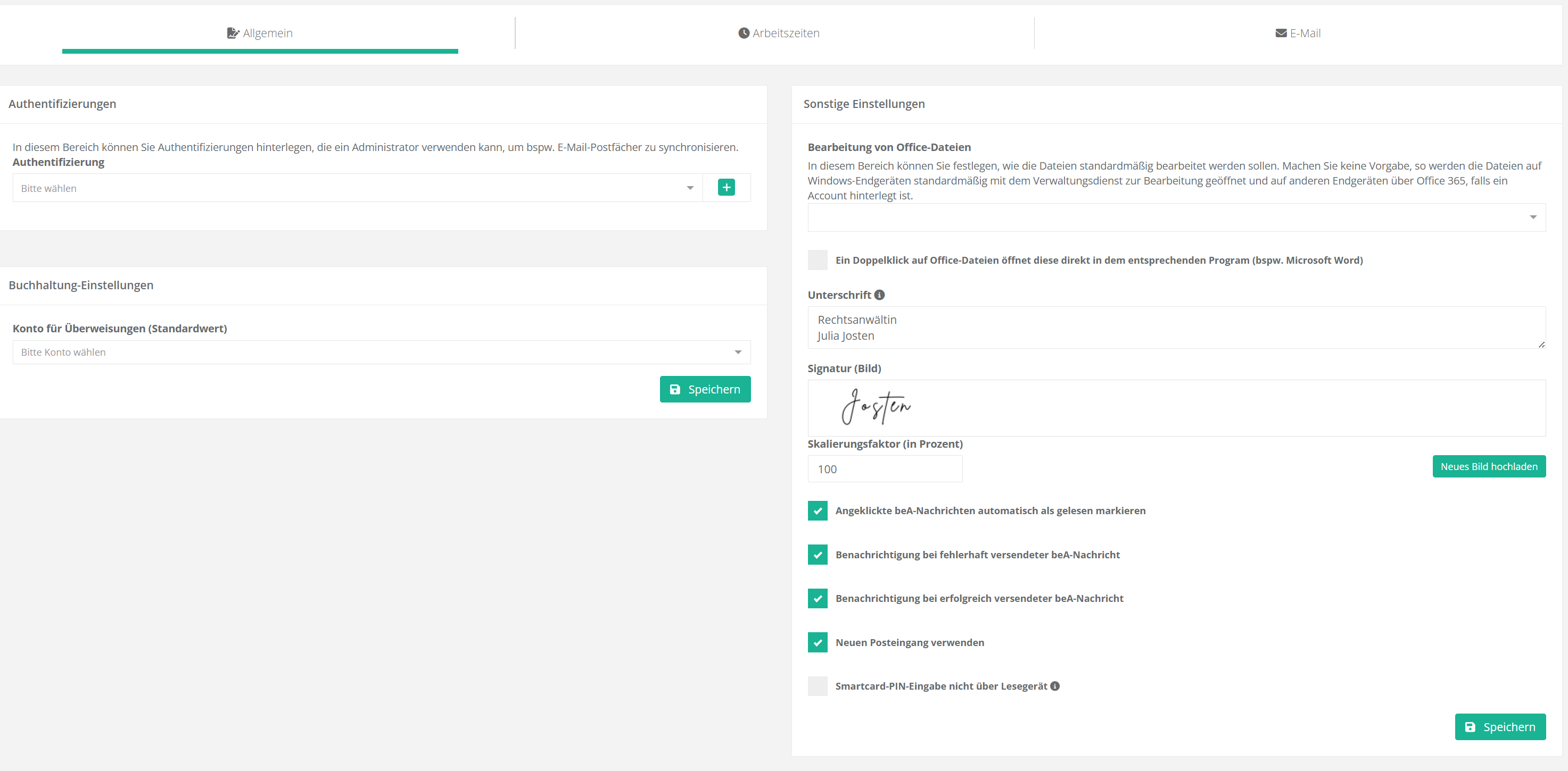 - Allgemein: Authentifizierung, Buchhaltung-Einstellungen, Sonstige Einstellungen
