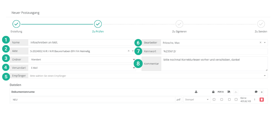 - optional Kommentar: Versehen Sie Ihren Postausgang mit individuellen Kommentaren, bspw. mit Info zum weiteren Bearbeitungsschritt.