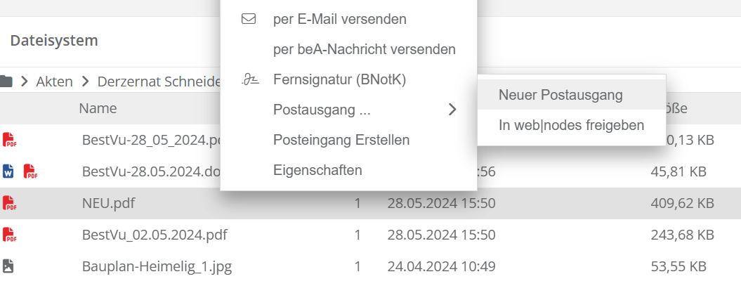 Der Postausgangsworkflow, wie oben beschrieben, wird häufig genutzt, um eine beA-Nachricht samt Anhängen für die Signatur bzw. den Versand vorzubereiten.