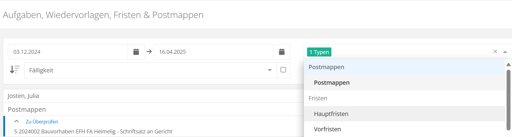 Hier kann nach dem Typ „Postmappe“ gefiltert werden.