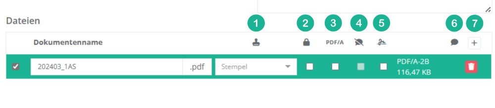 - Stempeln: Sie können Ihr Dokument mit Hilfe von eigenen und im System hinterlegten Anlagenstempeln versehen.