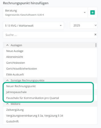 Neben der umfassenden Liste aller RVG-Gebühren und verschiedener Honorarschlüssel für die Zeiterfassung, können Sie auch weitere wiederkehrende Rechnungspunkte konfigurieren und fest in der Software speichern.