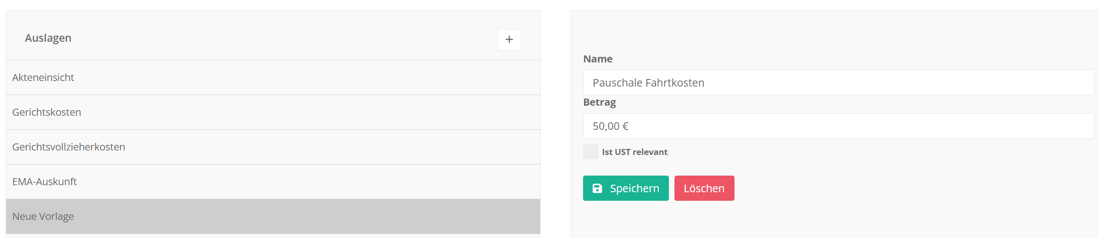 Hierbei können Sie angeben, ob es sich um eine umsatzsteuerrelevante Position handelt (eigene Auslage vs. fremde Auslage).