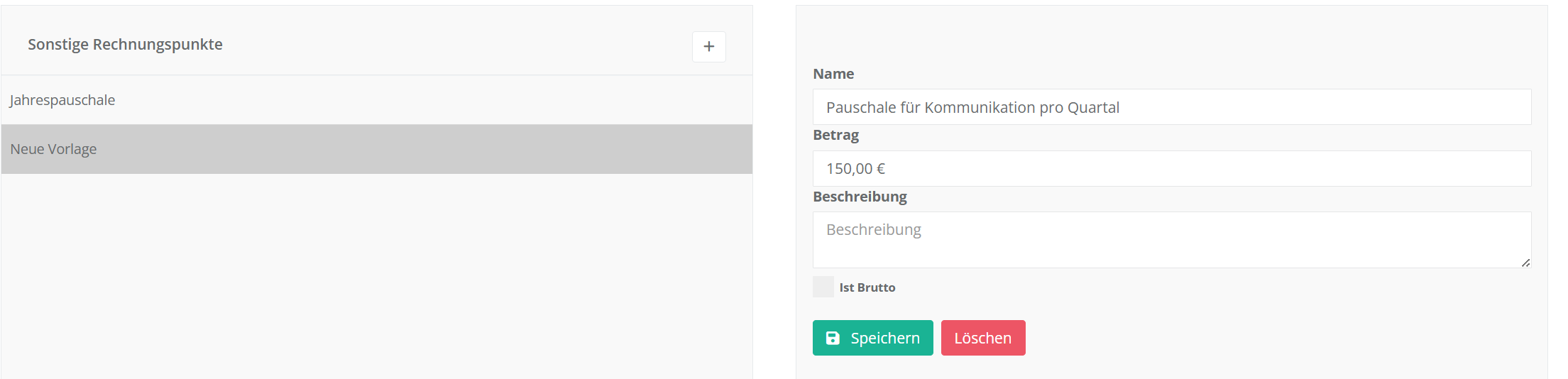 Neben einer Beschreibung können Sie zudem vermerken, ob dieser Rechnungspunkt in brutto oder netto hinzugefügt werden soll.