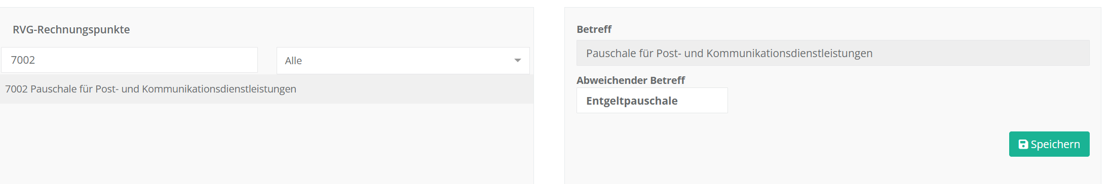 Hinsichtlich der hinterlegten RVG-Gebührentabelle können Sie keine Änderungen an den jeweiligen Werten und Ziffern vornehmen, jedoch können Sie einen alternativen Betreff wählen, unter dem der Rechnungspunkt dann auf der Rechnung erscheint.