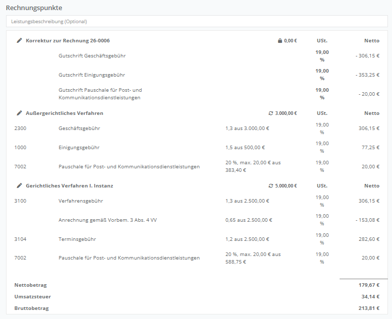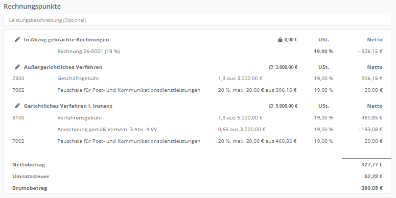 Die Vorschussrechnung(en) wird im nächsten Schritt direkt aufgeführt und Sie können anschließend zu jedem Rechtsvorgang alle abschließend entstandenen Gebühren und Auslagen hinzufügen. Der Vorschussbetrag wird automatisch abgezogen und Sie können Ihre Abschlussrechnung final erzeugen.