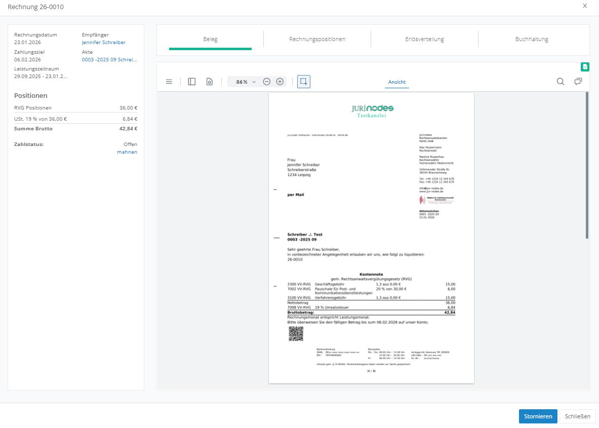 jur|nodes versteht unter einer Stornorechnung die vollständige Stornierung einer bereits gebuchten Rechnung. Also wirklich ausnahmslos die gesamte, bereits erstellte und gebuchte Rechnung mit allen Rechnungspositionen wird komplett im Ganzen storniert.