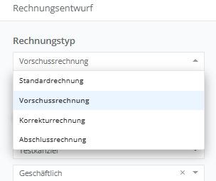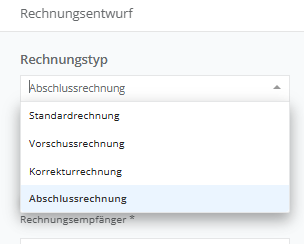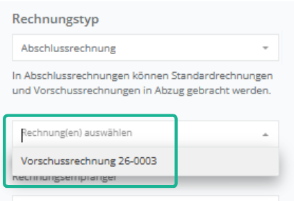 Zur Erstellung einer Abschlussrechnung wählen Sie im Rechnungsentwurf den entsprechenden Typ sowie die zu verrechnende Vorschussrechnung oder Standardrechnung (auch mehrere gleichzeitig möglich) aus.