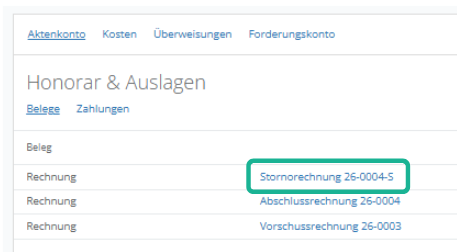 Zur Stornierung Ihrer fehlerhaften Rechnung gehen Sie bitte in Ihr Aktenkonto und klicken auf die entsprechende Rechnung. Es öffnet sich der Rechnungsbeleg in dem Buchungsmodul.