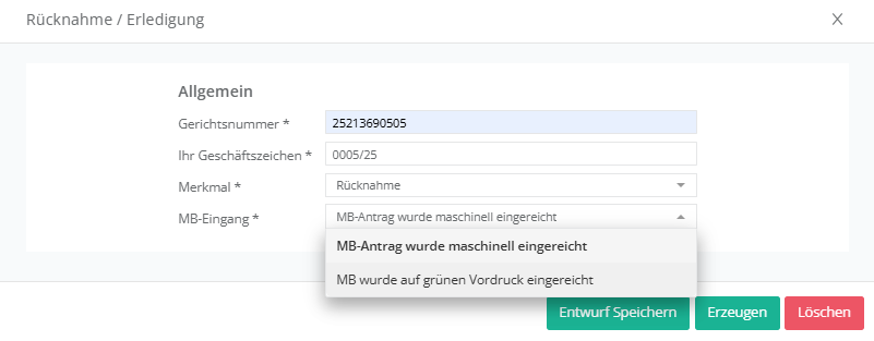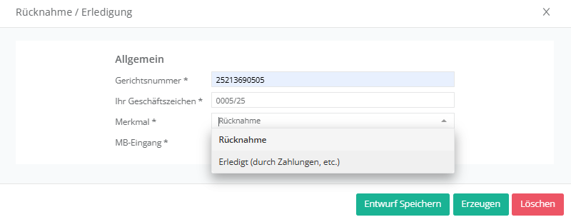 In der nächsten Maske können Sie nähere Angaben zur Erledigung des Verfahrens machen. Das Geschäftszeichen des Zentralen Mahngerichts sowie Ihr eigenes Aktenzeichen sollte bereits vorausgefüllt sein.