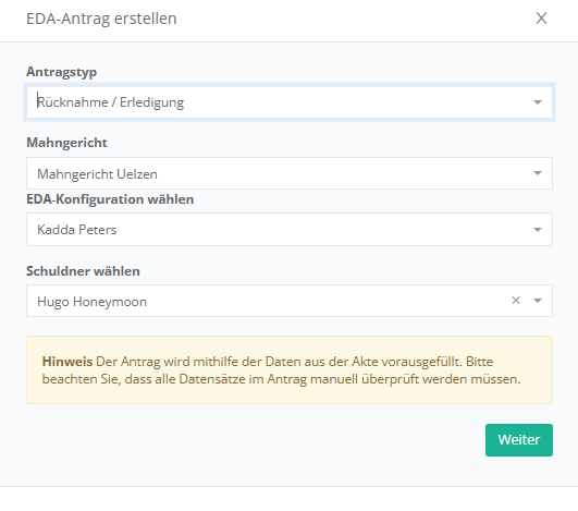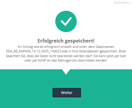 Das zuständige Zentrale Mahngericht und Ihre EDA-Konfiguration sollten bereits vorausgewählt sein. Klicken Sie auf „Weiter“.