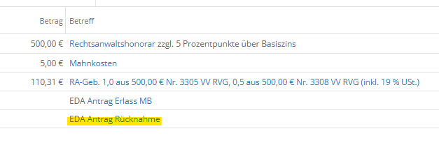 Im Forderungskonto finden Sie nun auch automatisch die Angabe, dass ein Rücknahme erstellt wurde. Durch Anklicken des EDA Antrags können Sie jederzeit Ihre getätigten Angaben nachprüfen.