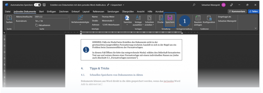 Dokumente können aus Word direkt in die Akte gespeichert werden, wenn das jur|nodes Word-AddIn aktiviert ist. In diesem Artikel erhalten Sie einen Einblick in das schnelle Speichern von Dokumenten in Akten. Im weiteren Verlauf finden Sie außerdem einen Überblick, wie gespeicherte Dokumente bearbeitet werden können.